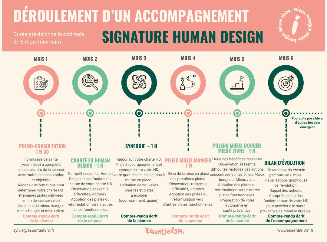 Présentation du plan d’accompagnement en 3 piliers Mieux manger, Mieux bouger, Mieux vivre visant à l’adoption de nouvelles pistes fonctionnelles issues du croisement de votre charte Human Design et des fondamentaux de la santé préventive. Quoi ? Quand ? Comment ?